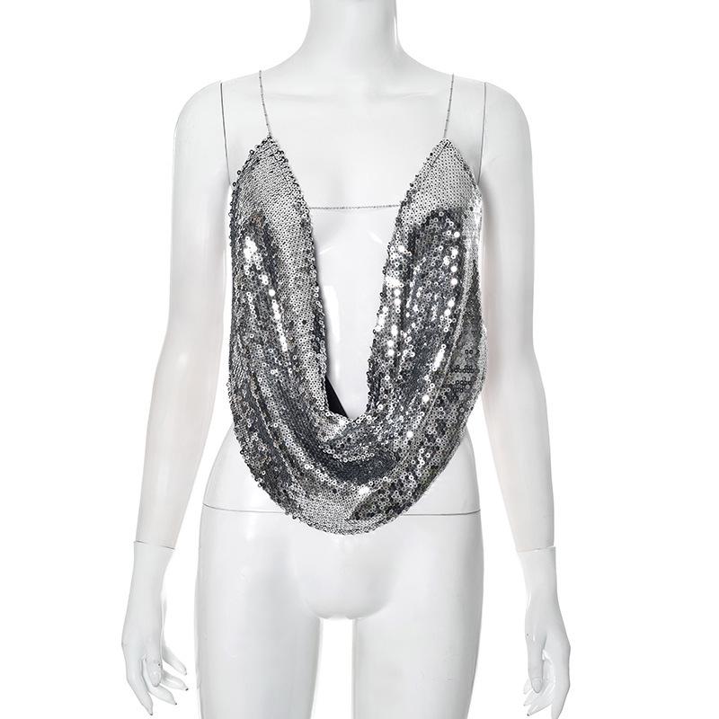 European & American Women's Sequin Chain Spaghetti Strap Open-Back Swing Neck Top