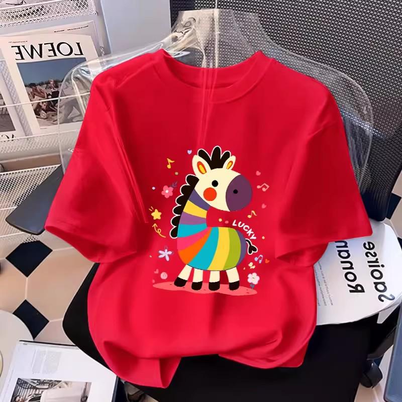 This vibrant women's T-shirt features a playful cartoon pony print, perfect for adding a fun touch to your wardrobe. Crafted from soft and breathable cotton, it offers a comfortable fit and relaxed style. The design includes short sleeves and a classic round neckline, making it an ideal choice for casual outings. As a special Zodiac Horse Year Edition, it's a unique piece for those who appreciate whimsical fashion.