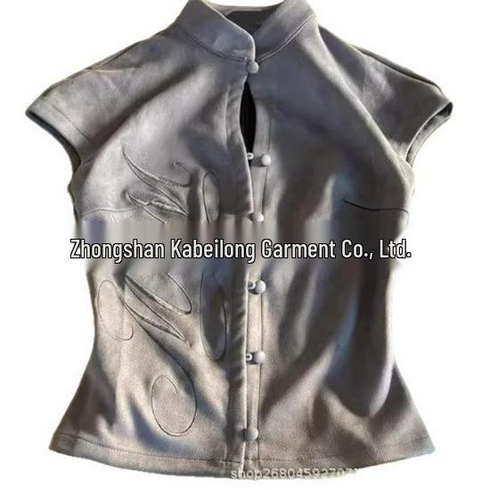 Elevate your style with this light gray cropped top, featuring intricate embroidery and a trendy stand collar. Designed with a distinctive frog button for a touch of unique flair, this top is crafted from high-quality polyester, ensuring both comfort and durability. Its solid pattern and short sleeves make it a versatile piece, perfect for pairing with your favorite high-waisted jeans or skirts for a chic, modern look.