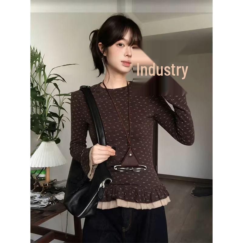Women's Floral Lace Flannel Long-Sleeve Top - Slimming, Double-Layered Design for Autumn/Winter