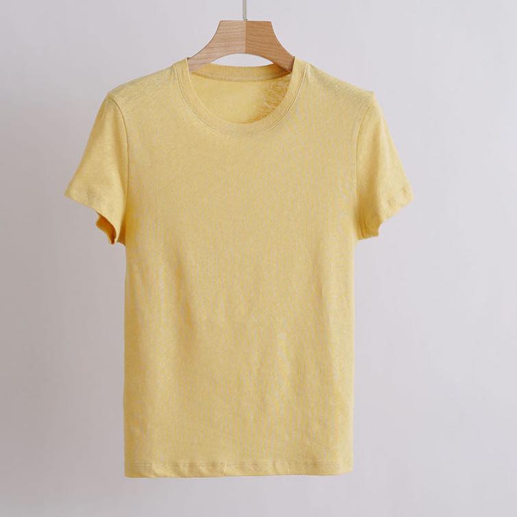 Slim Fit Round Neck Short Sleeve Women's T-shirt in Bright Spring Day Creamy Goose Yellow, Soft Bamboo Linen Cotton Blend