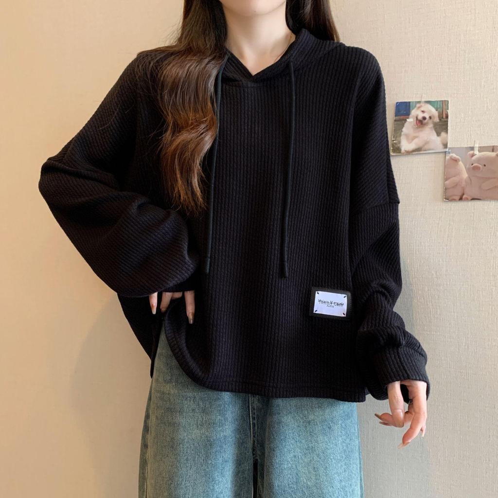 Women's Plus Size Ribbed Hoodie, Long Sleeve, 2025 Autumn/Winter, Korean Style, Loose, Slimming, Versatile, Warm Top