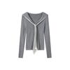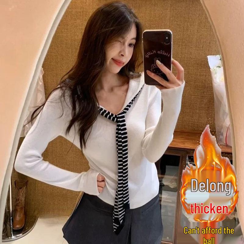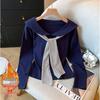 Korean Style Drop Shoulder Naval Collar Long Sleeve Top for Women, Slim Fit Flowy Ribbon Design, Perfect for Spring/Autumn.