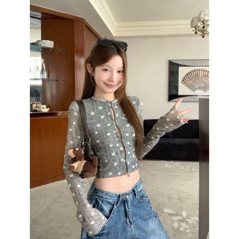 Spicy Girl Grey Polka Dot Long Sleeve Cropped T-Shirt for Women - Autumn Korean Style, Chic & Slimming