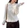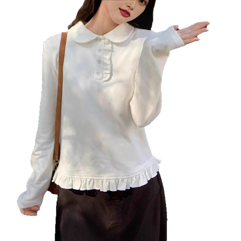 Embrace elegance with this women's autumn 2025 white T-shirt, featuring a charming doll collar and long sleeves. Crafted from the luxurious derong material, this piece offers a soft and comfortable fit, perfect for cooler days. The classic design and sophisticated details make it a versatile addition to any wardrobe, effortlessly elevating your everyday style.