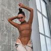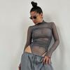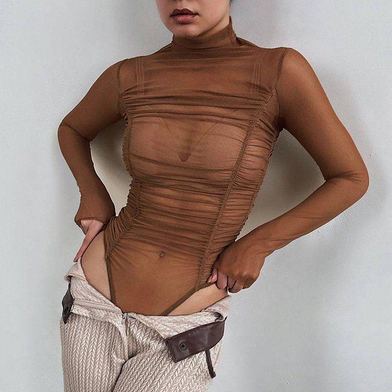 Women's Mesh See-Through Long-Sleeved Bodysuit - Chic High-Waisted Slim Fit Top