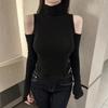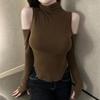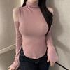 Korean High Neck Off-the-Shoulder Sheer Slimming Long Sleeve Curved Hem Women's Top