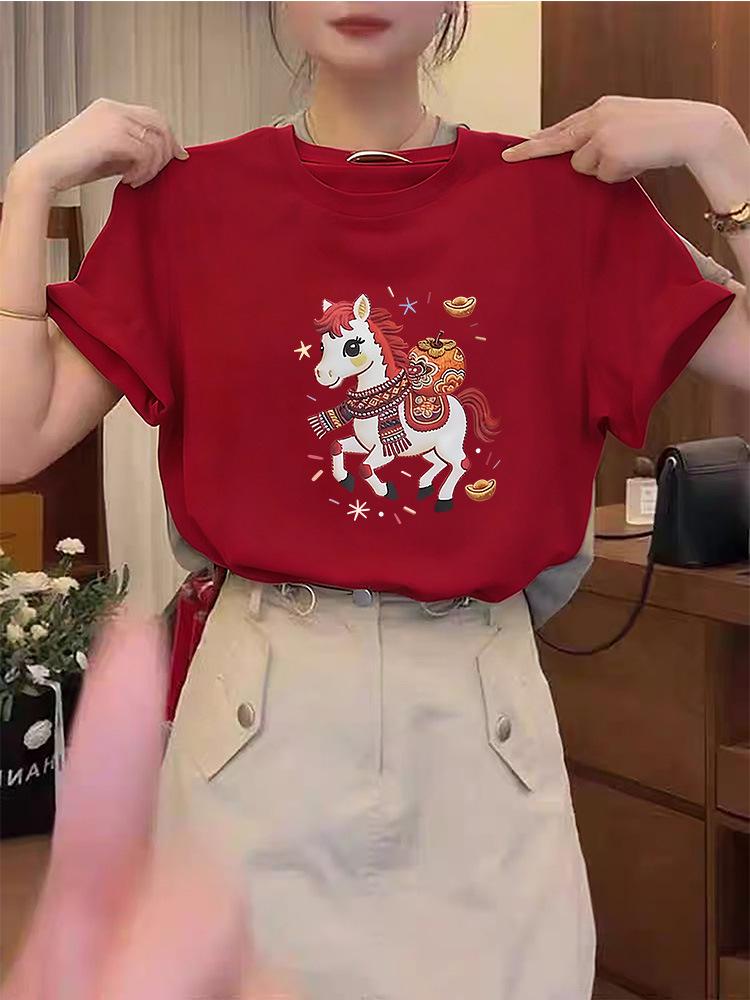 Introducing a stylish and versatile short-sleeve T-shirt made from pure cotton, perfect for adding a pop of color to your wardrobe. This fashionable red top features a comfortable round neckline and a chic print decoration, making it a great choice for layering or wearing on its own. Its breathable cotton material makes it ideal for spring, summer, and autumn, promising both comfort and style throughout the seasons.