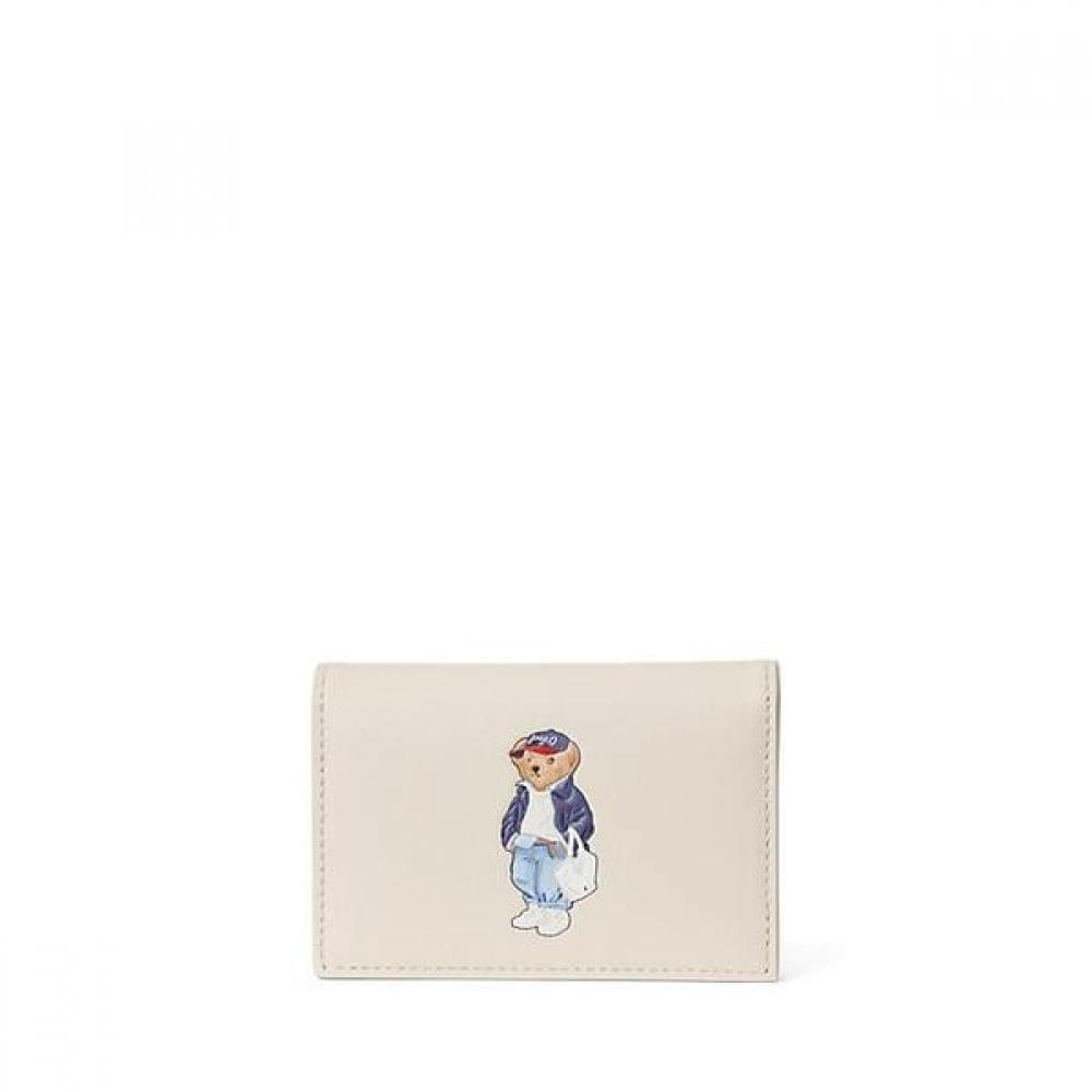 This product is a slim silhouette card case made from full grain leather. It features the signature Ralph Lauren ensemble dressed Polo Bear and is designed to conveniently store standard cards and small bills. It has 2 card slots, and the interior includes a snap closure to keep contents safe. The interior is lined with cotton, providing a soft feel. Additionally, the front center showcases the Polo Bear print and embossing, while the back is debossed with "Polo Ralph Lauren".