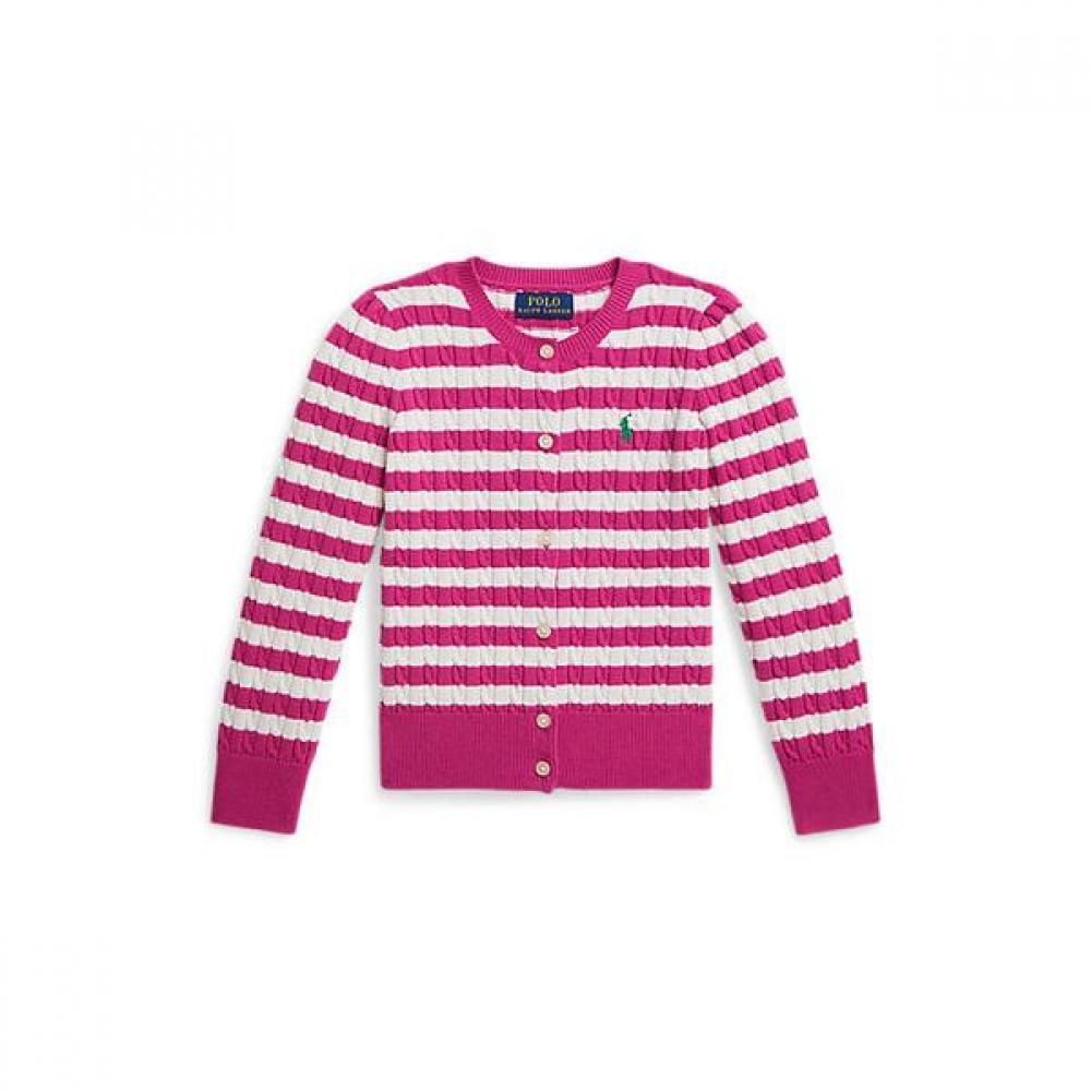 This cardigan can be worn in a cute layered look in any season. It is made of medium weight combed cotton yarn and features vibrant stripes and mini cable patterns.