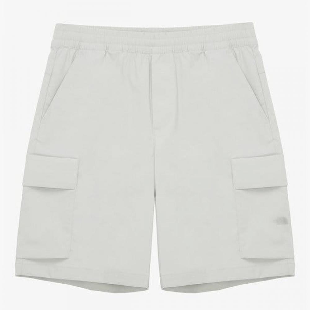 This product is the Men's All-Round Cargo Shorts (Model: NS6NQ11B), featuring a regular fit and knee-length design suitable for both men and women. Made from stretchable woven cooling material, these shorts keep you comfortable even in hot weather. The full-band style features a drawstring for a snug fit, and side pockets add to the practicality. Color: LIGHT GRAY.
