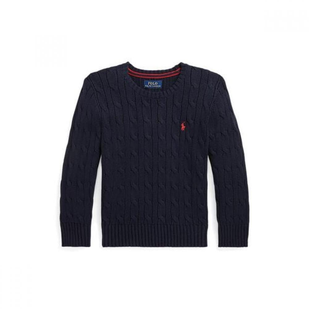 The Polo Kids Boys' 2-7 Years Cable Knit Cotton Sweater is made from medium-weight combed cotton yarn, offering a soft touch. A signature pony embroidery is featured on the left chest, adding an elegant touch. The color of the product is navy.