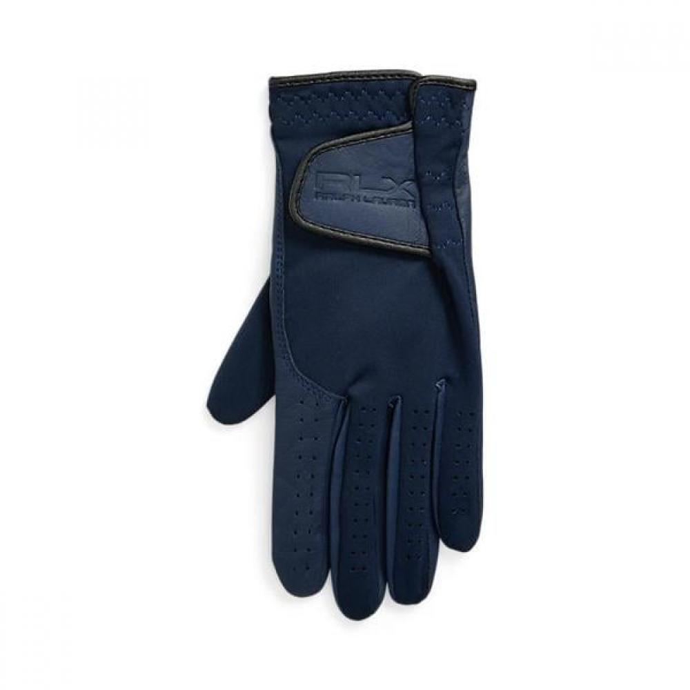 This golf glove features a cabretta leather trim for flexibility and durability, providing a stable grip. The adjustable strap on the wrist is embossed with the signature 'RLX' logo. The color is refined navy.