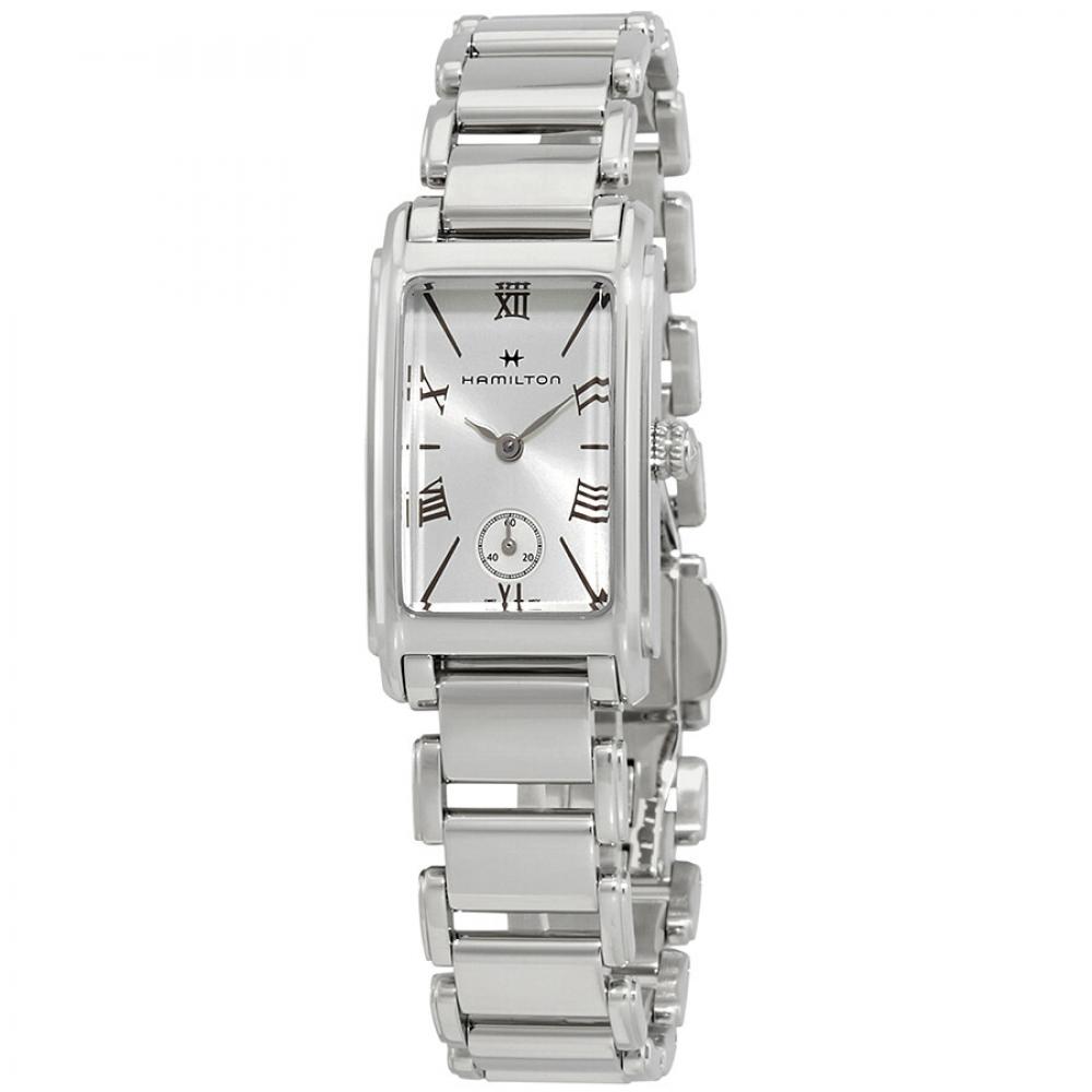 Stainless steel case with a stainless steel bracelet. Fixed stainless steel bezel. Silver dial with silver-tone hands and alternating Roman numeral and index hour markers. Dial Type: Analog. Small second sub-dial at the 6 o'clock position. ETA caliber 980.153 quartz movement. Scratch resistant mineral crystal. Pull / push crown. Solid case back. Rectangle case shape. Case dimensions: 18,7 mm x 27 mm. Case thickness: 6.9 mm. Band width: 14 mm. Deployment clasp. Water resistant at 30 meters / 100 feet. Functions: hour, minute, small second, battery eol indicator. Casual watch style. Watch label: Swiss Made. Hamilton Ardmore Silver Dial Ladies Watch H11221114.