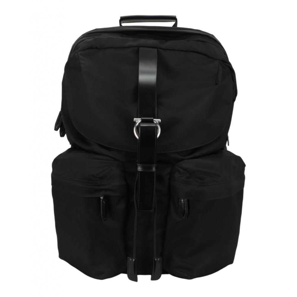 The Salvatore Ferragamo Nylon Gancini Technical Backpack in black features dimensions of 11.38 inches in length, 6.44 inches in width, and 16.06 inches in height. The strap drop length is 19.06 inches and the handle drop length is 1.81 inches. It includes a zippered closure with a front flap top and an interior drawstring closure. There is one interior zip pocket and one interior slip pocket, along with two exterior zip pockets. The design features silver-tone Gancini hardware, grosgrain and leather trim. The padded mesh back showcases a Gancini seamed pattern, with two adjustable shoulder straps and one top handle. The main material is 100% nylon, and the trim is 100% leather, made in Italy.