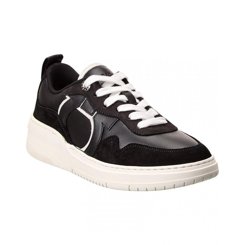 The Salvatore Ferragamo Dania Leather & Suede Sneaker features a luxuriously crafted combination of black leather and suede, accompanied by silver-tone hardware. The lace-up closure and lightly padded leather insole provide both style and comfort, while the rubber sole offers traction for stability with each step. Embracing the iconic Gancini and Vara designs, these sneakers exude sophistication and style.