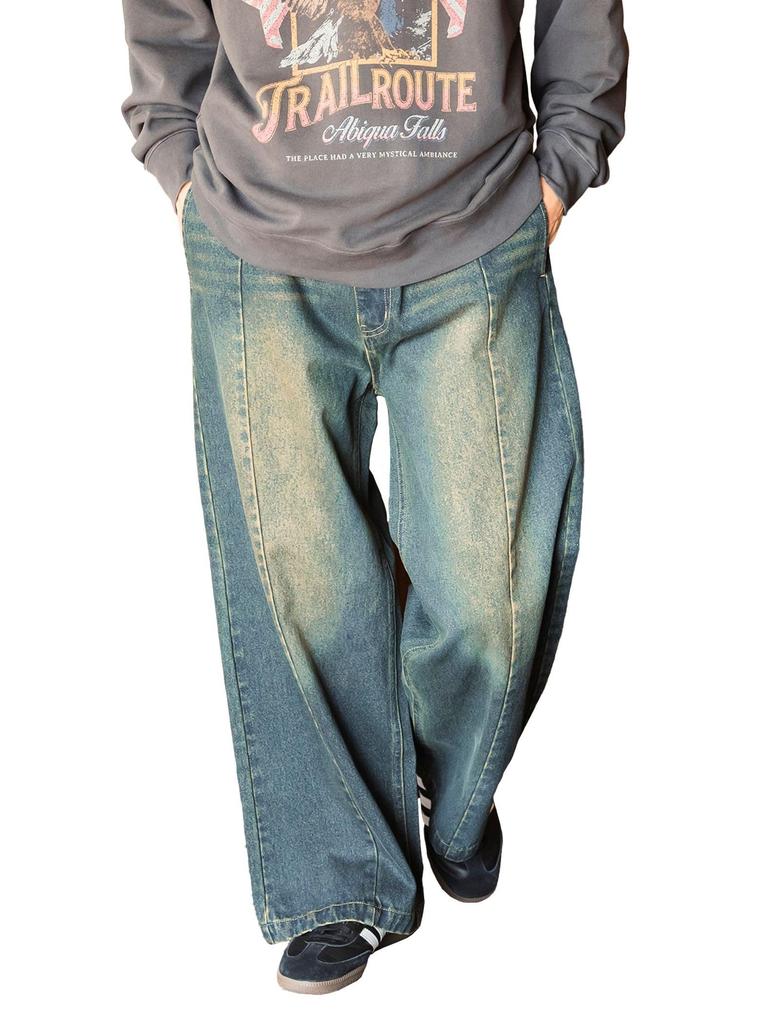 [Country of Origin]: Made in China [Product Specifications]: SIZE: S Waist: 78.0cm Rise: 33.0cm Inseam: 74.6cm Leg opening: 57.2cm Thigh: 65.6cm Hip: 103.2cm / SIZE: M Waist: 83.0cm Rise: 34.0cm Inseam: 76.0cm Leg opening: 60.0cm Thigh: 66.8cm Hip: 104.2cm / SIZE: L Waist: 87.0cm Rise: 35.0cm Inseam: 77.6cm Leg opening: 61.0cm Thigh: 70.0cm Hip: 108.8cm The latest denim that makes a statement ■Design These baggy pants are made from a moderately thick denim, and are a modern take on the street trend of the 2000s. The beard blast processing and indigo are heavily overdyed, highlighting the texture of the processing at the center seam. ■ Coordination The baggy silhouette is accentuated by keeping the top compact, and it pairs perfectly with sneakers or boots. ■Size The wide leg opening creates a baggy silhouette. The waist and hips are just the right size, giving a clean impression around the waist. ■Material Made with just the right amount of thick denim, the three-dimensional texture and deep color created through processing techniques create a vintage-like atmosphere. *Please note that due to the processing of the denim, there may be individual differences in the color fading of the denim. *For the color of the product, please refer to the image of the product alone taken on a white background. *Please note that the actual color may differ depending on the lighting conditions of outdoor photos and your viewing environment (computer).