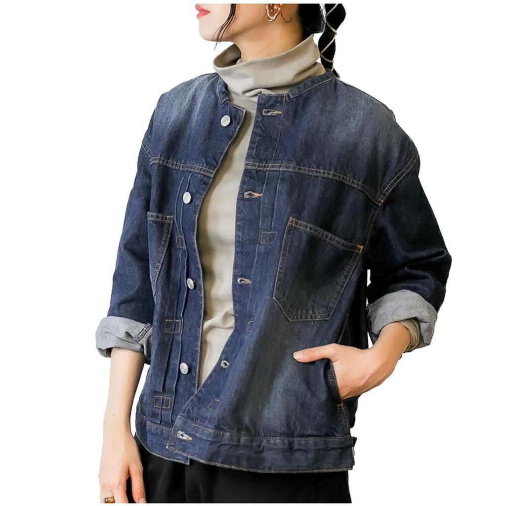 This round-collar denim jacket accentuates femininity and can be easily worn to create a sophisticated, casual look.