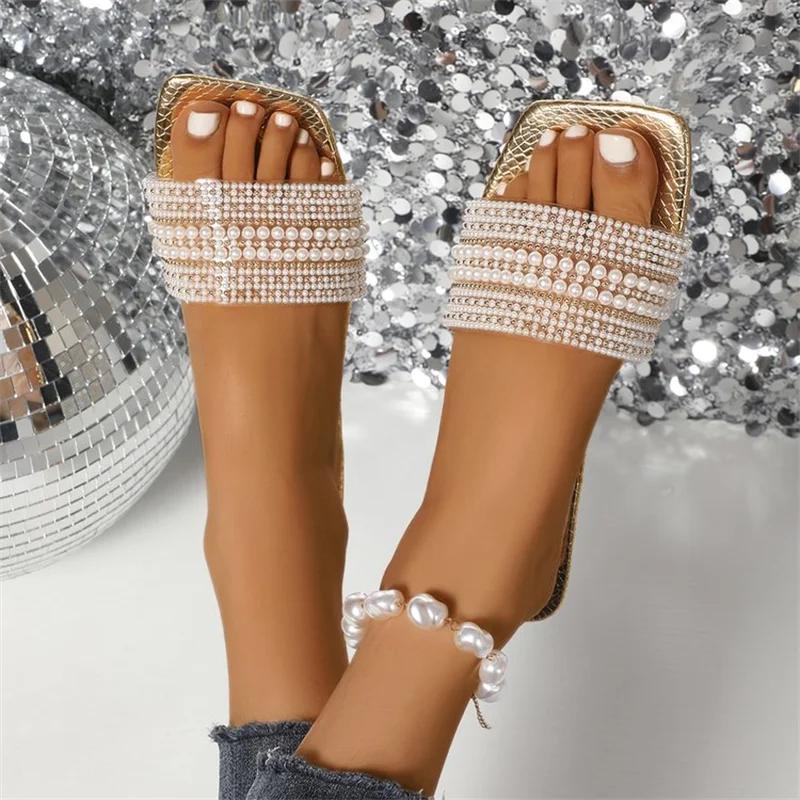 summer fashionable sexy light casual women's shoes large size comfortable square head pearl decoration solid color flat slippers