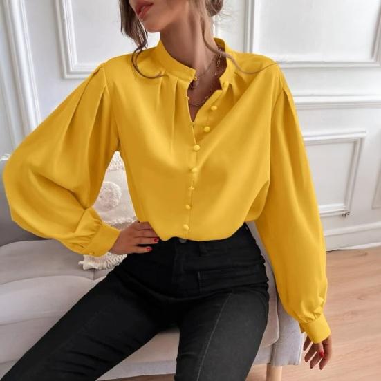 Women Shirt Stand Collar Puff Long Sleeve Buttons Placket Shirt Tops Pure Color Loose Fit Casual Shirt Commuting Style Office Lady Tops