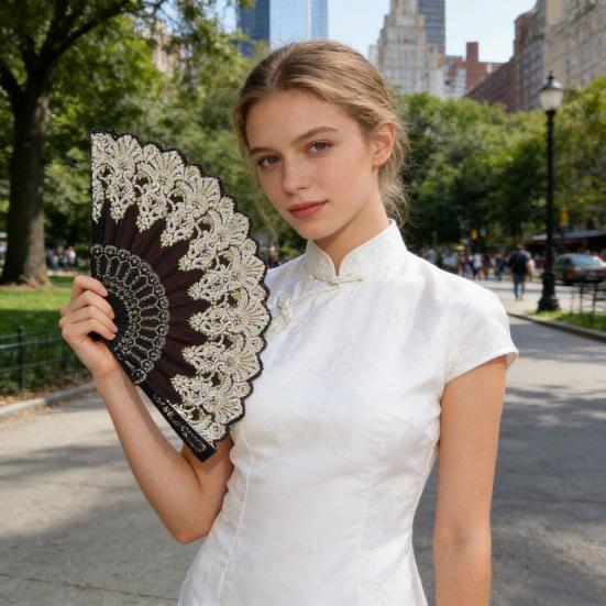 Yelpaze yüzeyi, geleneksel Çin desenlerini Avrupa retro tasarımlarıyla ustaca harmanlar, siyah-beyaz mürekkep veya yaldızlı arabesk stillerde mevcuttur.. Kokusuz ve çok yönlü bu dayanıklı “demir yelpaze”, dans, tiyatro, düğünler, partiler ve açık hava etkinlikleri için uygundur.