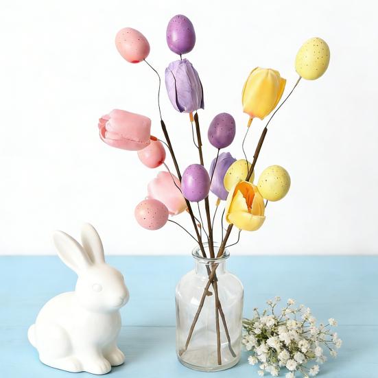 Easter Eggs Picks Spring Artificial Tulip Flower Stem with Eggs Floral Arrangement for Home Vase Filler Table Centerpiece