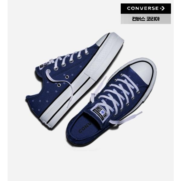The Converse A16114C Chuck Taylor All Star Lift High-Top Canvas Sneakers Platform Indigo Storm is a platform sneaker based on the classic Chuck Taylor All Star design. It features a lift platform outsole that provides height and embroidered star detail as a highlight. The insole is equipped with Ortholite cushioning, offering optimal comfort for the feet. The color is Indigo Storm and the model number is A16114C.