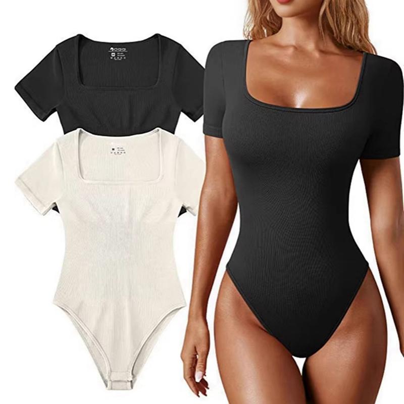 Women's Square Neck Bodysuit Ribbed Short Sleeve Sports Yoga Shapewear