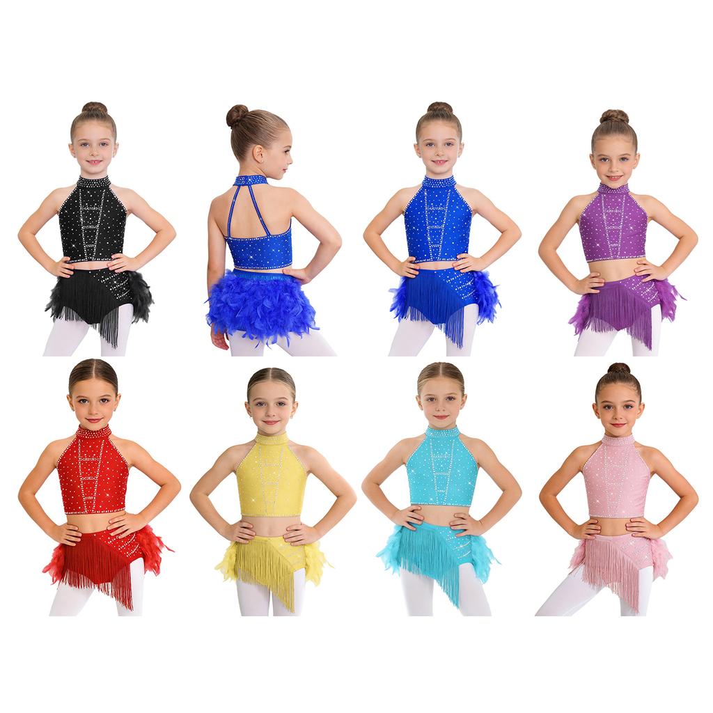 Çocuk Kızlar İçin Pırıltılı Püsküllü Tüy Dans Kostümü: Sahne Performansı İçin Askılı Sırtlı ve Lastikli Belli Crop Üst ve Etek Seti