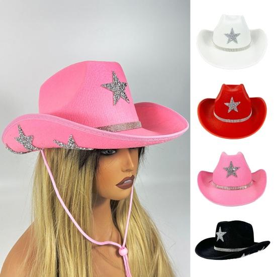 Eye-Catching Design: Featuring a classic western cowboy hat silhouette enhanced with sparkling crystal star trim and a wide brim, this hat adds a dazzling touch to any outfit. The glittering accents make it a standout accessory that effortlessly blends traditional style with festive sparkling.