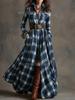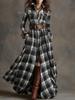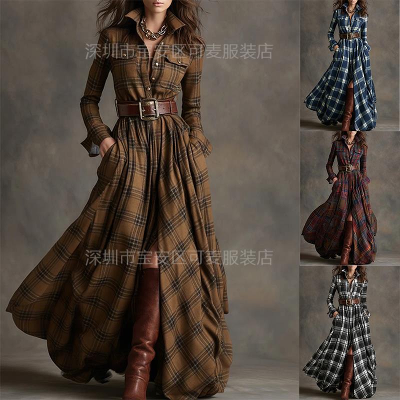New retro plaid waist and thin irregular design lapel long-sleeved dress women