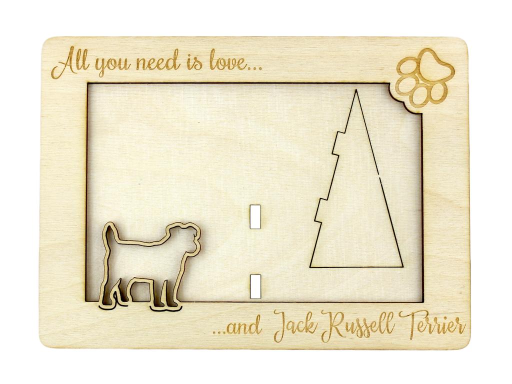 Jack Russell Terrier - Photo frame, engraved wooden frame, a lovely gadget for the dog lover by Art-Dog If you like to surround yourself with decorations related to your dog's breed, this frame will be perfect for displaying a photo of your pet!The frame is made from birch plywood and decorated with a charming engraving. It has a hole for wall mounting and a support that will allow you to place the frame on a shelf or desk (look at the instructions in the photo). The frame is made in such a way that there is a slot along the top edge through which you need to slide your photo.This product can be personalised for you - we can engrave your dog's name instead of the breed name.We have nearly 200 dog breeds in our collection - find the perfect frame for you in our listings. Don't see a suitable product? Let us know, we'll be sure to help! Dimensions: 18.5x13.5 cm, suitable for a 10x15 cm photoMaterial: birch plywoodPlywood is a material of natural origin. Due to the nature of the material, the resulting product may differ slightly in colour from the example shown. As the frame is laser cut, minor burn marks at the edges are a normal effect and are not subject to complaints. The Jack Russell Terrier is a small, energetic breed known for its intelligence, fearlessness, and determined nature. Standing 10 to 15 inches tall, they have a smooth or rough coat that is predominantly white with black or tan markings. Originally bred for fox hunting, their boundless energy and tenacious spirit make them well-suited for various dog sports. They thrive on mental and physical stimulation, requiring plenty of exercises to stay content. Discover our exclusive collection of premium dog-themed products, designed to capture the essence of your beloved pets. Our catalog features an array of beautifully handcrafted dog figurines, stylish dog keychains, and elegant dog necklaces, all set on luxurious wooden or marble bases for an added touch of sophistication. Our unique hanging dog statues and customizable dog urns are perfect for those seeking a special way to remember their furry friends. Our specialty Big Head dog statues are expertly crafted to highlight the individual traits and personalities of different dog breeds, making them perfect additions to any collector's display or as thoughtful gifts for dog lovers. These statues are not just decor but a celebration of the canine spirit. Each piece in our collection is made with superior craftsmanship and high-quality materials, ensuring that you receive a product that stands the test of time. Our dog-themed accessories, including personalized dog items, are ideal for enhancing your home's decor or for gifting to those who cherish their pets. Shop with us today and find the ultimate expression of canine admiration through our select dog sculptures, keychains, and more, all curated to offer you the best in dog-themed luxury. Our handcrafted dog-themed collection is a labor of love, designed to capture the hearts of dog enthusiasts everywhere. Each piece starts with the finest raw materials, carefully selected for their ability to detail the distinct aspects of various dog breeds. Our talented artisans then handcraft each figurine, keychain, and necklace, focusing on bringing out the individuality and charm of breeds ranging from the sturdy Bulldog to the sleek Greyhound. The meticulous process involves detailed sculpting, where every texture and nuance is considered, ensuring that each feature—from fur waves to playful poses—is faithfully reproduced. Following the sculpting, a specialized hand-finishing technique is applied, enhancing the realistic appearance of each piece. Colors are carefully chosen and applied to bring each breed’s characteristics to life, from the deep browns of a Chocolate Lab to the spotted coat of a Dalmatian. Each item in our collection is not just a product but a piece of art, reflecting the uniqueness of our canine friends and the craftsmanship of our artisans. These pieces serve as perfect gifts or keepsakes for dog lovers, offering a way to cherish their furry friend's memory or celebrate their presence in a meaningful, lasting way.