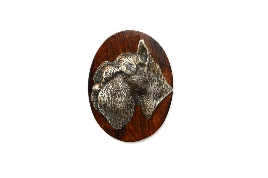 Use this stylish and elegant clip-on brooch to display your dog show entry number. This pin is handmade from wood and decorated with a beautiful silver-plated dog's head corresponding to your pet's breed. It has a safety pin on the back, which you can easily and securely pin the accessory to your clothing, and a clip to grab the number. The clip is tucked away so that you can confidently use the brooch as a decoration even outside of shows. The product is handmade in a small workshop in Poland. Give yourself or a loved one a bit of luxury in the form of such a unique handicraft.Dimensions: 5x7 cmBase material: WoodOrnament material: Zinc-aluminium alloy (ZnAl), silver-plated. The product is subjected to a patination process.