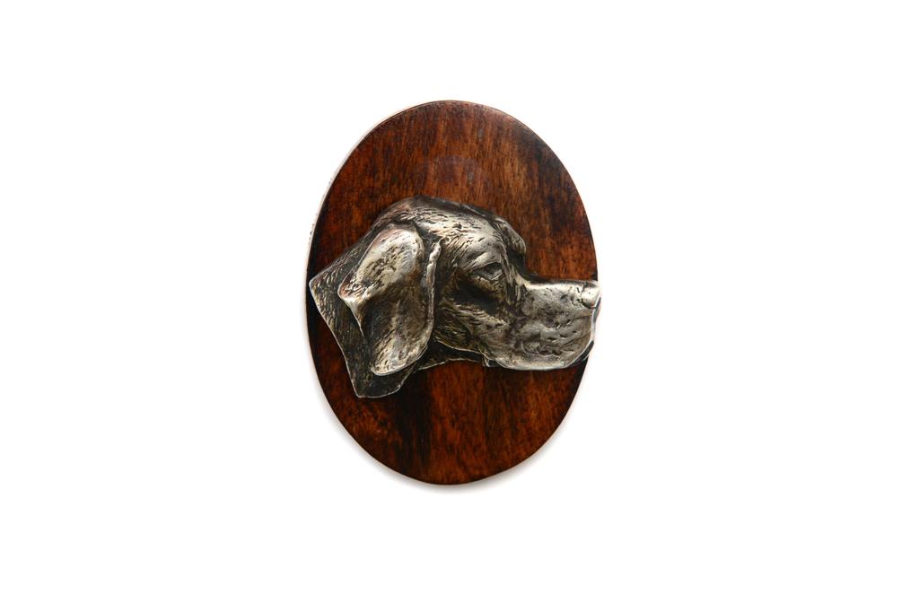 Use this stylish and elegant clip-on brooch to display your dog show entry number. This pin is handmade from wood and decorated with a beautiful silver-plated dog's head corresponding to your pet's breed. It has a safety pin on the back, which you can easily and securely pin the accessory to your clothing, and a clip to grab the number. The clip is tucked away so that you can confidently use the brooch as a decoration even outside of shows. The product is handmade in a small workshop in Poland. Give yourself or a loved one a bit of luxury in the form of such a unique handicraft.Dimensions: 5x7 cmBase material: WoodOrnament material: Zinc-aluminium alloy (ZnAl), silver-plated. The product is subjected to a patination process.