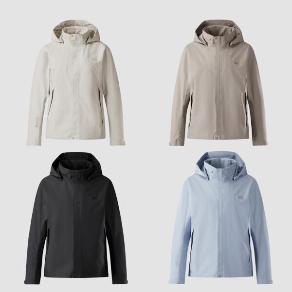 The KOLON SPORT Women's Gore-Tex 2L Waterproof Jacket features waterproof and breathable functions, including water-repellent and windproof capabilities. The seams are perfectly sealed, and it has a detachable hood design. The Gore-Tex material used provides guaranteed waterproof functionality.