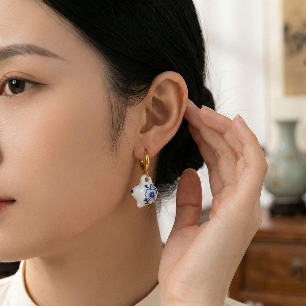 Chinese Style Blue and White Porcelain Earrings Dripping Oil Gold Enamel Hoop Earrings Girls