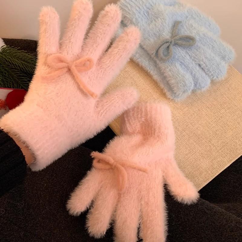 Plush Cute Butterfly Knot Knitted Gloves For Women In Winter, Anti Freeze Cycling Warmth Gloves Five-Finger Gloves