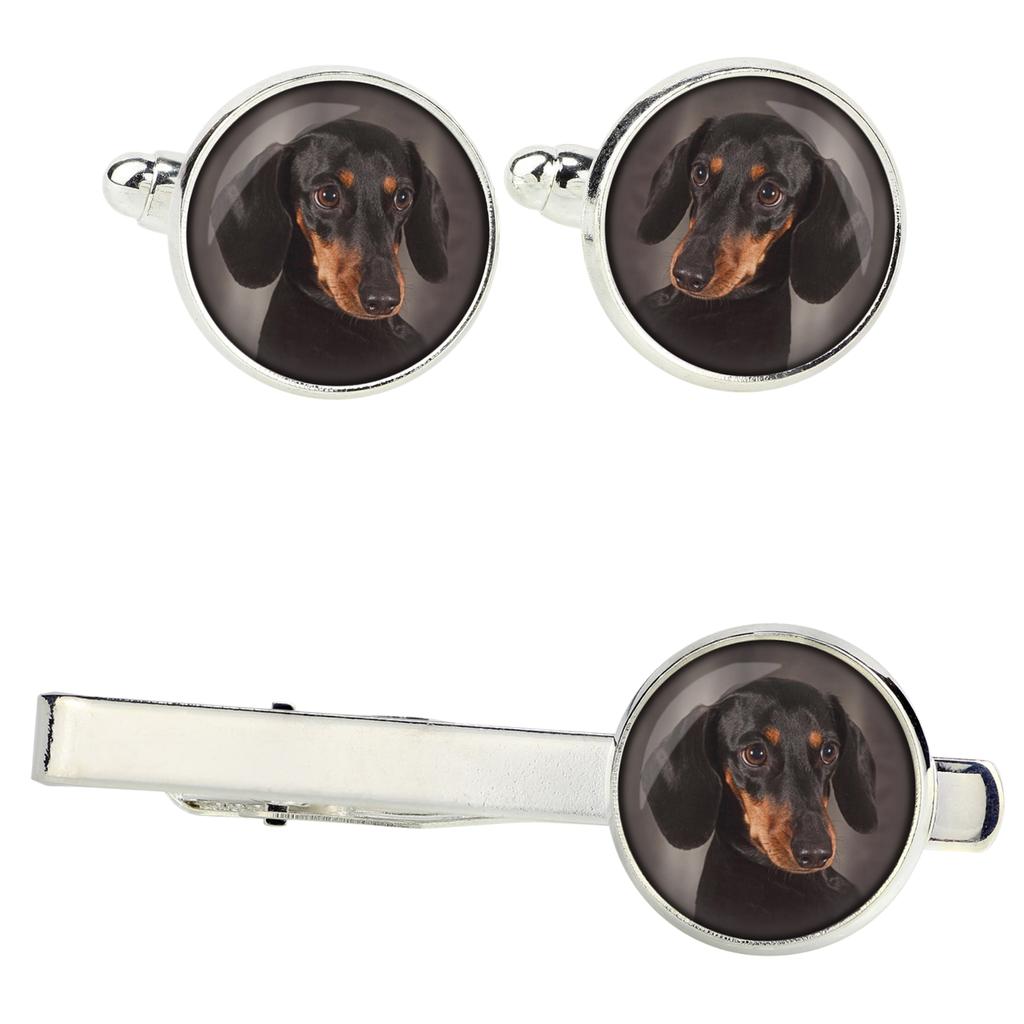 Handmade jewelry made with passion and for enthusiasts :)A unique set of men's jewelry with photos of four-legged friends. It was handmade with passion and attention to every detail.Cufflinks and tie clip with original photos embedded under convex glass and set in a hypoallergenic silver base (nickel-free).Cufflinks - photo diameter 14mm.Tie clip with a length of 5.4cm, with a photo diameter of 16mm.The photos are of the highest quality, with vivid colors, printed on high-quality photographic paper.The set is packed in an elegant gift box.FREE personalization: If you dream of unique jewelry with your own pet, or with any other themed photo - it is now possible to place a personalized order with your own photo or graphic :)Note! The jewelry is not waterproof. It is recommended to avoid getting wet in the rain and soaking the sleeves :)Colors may slightly differ from the displayed pattern, due to differences in displaying photos on monitors.