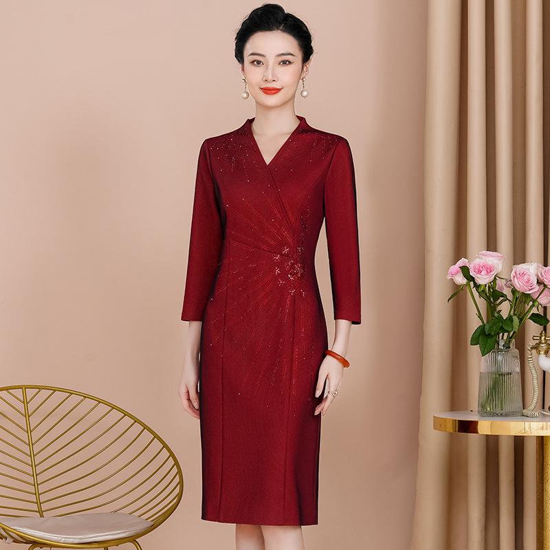 Experience timeless elegance with this knee-length dress, designed specifically for middle-aged women seeking a sophisticated look. Crafted from high-quality polyester material, this dress features a V-neckline that beautifully complements its slimming silhouette. Perfect for weddings and special occasions, it effortlessly combines style and comfort, ensuring you look and feel your best at any event.