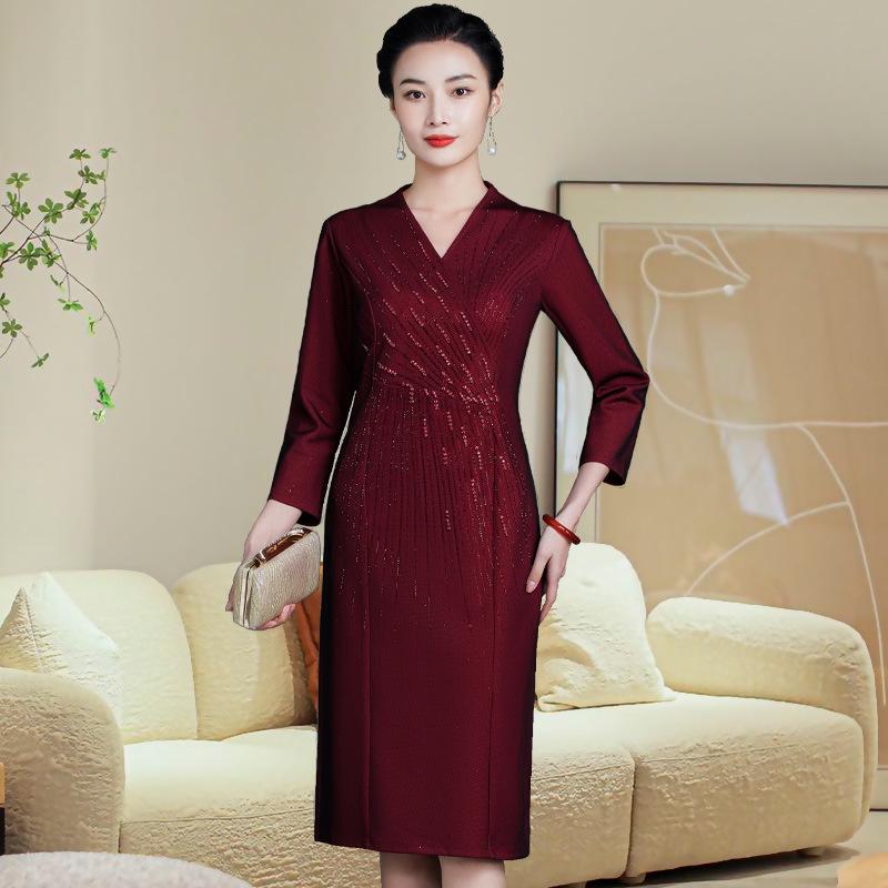 Introducing a sophisticated and stylish knee-length dress tailored for the elegant, middle-aged woman. This exquisite mother-of-the-bride wedding outfit, crafted from premium polyester material, promises both comfort and style. Highlighting a chic V-neckline, this dress is designed to flatter and enhance your appearance at any formal or celebratory event. Ideal for those seeking a fashionable and graceful look, it caters especially to plus sizes, ensuring a perfect fit for a memorable occasion.