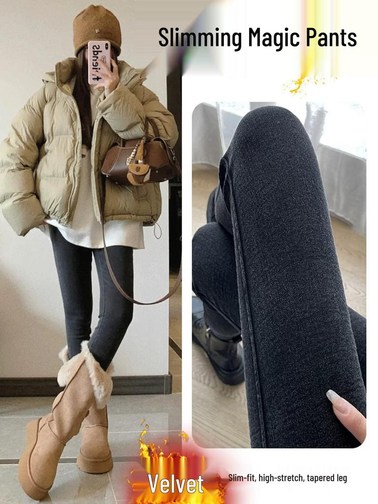 Stay cozy and stylish with these plus-size warm velvet leggings, designed to bring both comfort and fashion to your autumn and winter wardrobe. These leggings mimic the look of denim skinny pants, offering a slimming fit with their stretchy material. Crafted from a blend of viscose, nylon, and spandex, they are lined with a soft polyester and spandex mix for added warmth. The solid pattern offers a versatile piece that pairs well with a variety of tops and outerwear, ensuring you look chic while staying warm. Perfect for cooler seasons, these leggings are a must-have for any wardrobe.