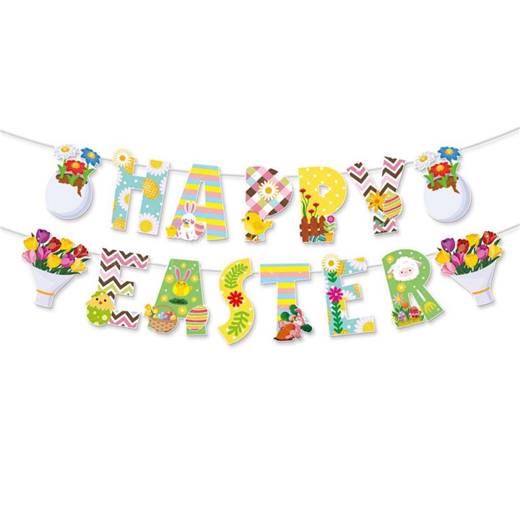 Easter Party DecorationDaisy Easter Egg Chicken Happy Easter Banner Theme : This is the "HAPPY EASTER" banner banner with Easter theme, decorated with Easter elements such as Easter eggs, rabbits, chicks, flowers, etc. The is fresh and lively, suitable for Easter parties and home decoration scenes.