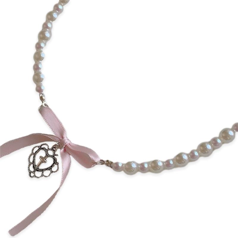 Sweet Pink Heart Necklace with Imitation Pearl Elegant Heart Cross Choker Clavicle Chain for Women Teen Fashion Jewelry