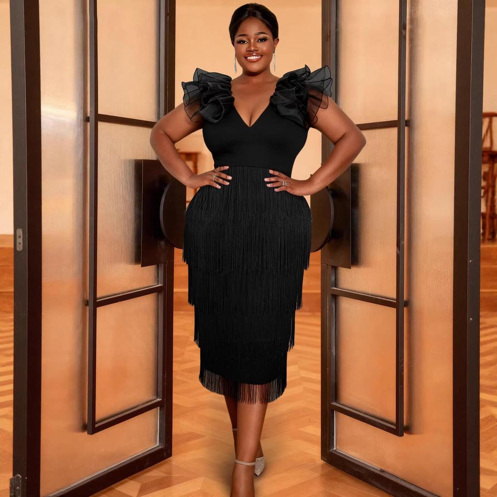 Discover the perfect blend of style and comfort with this plus-size dress. Featuring a sophisticated V-neckline, this dress showcases a solid pattern that exudes elegance. The highlight of this outfit is its playful fringe decoration, adding a touch of flair to your look. Crafted from polyester, it promises both durability and a comfortable fit. The charming ruffle sleeves enhance its feminine appeal, making it an ideal choice for any special occasion or a night out.