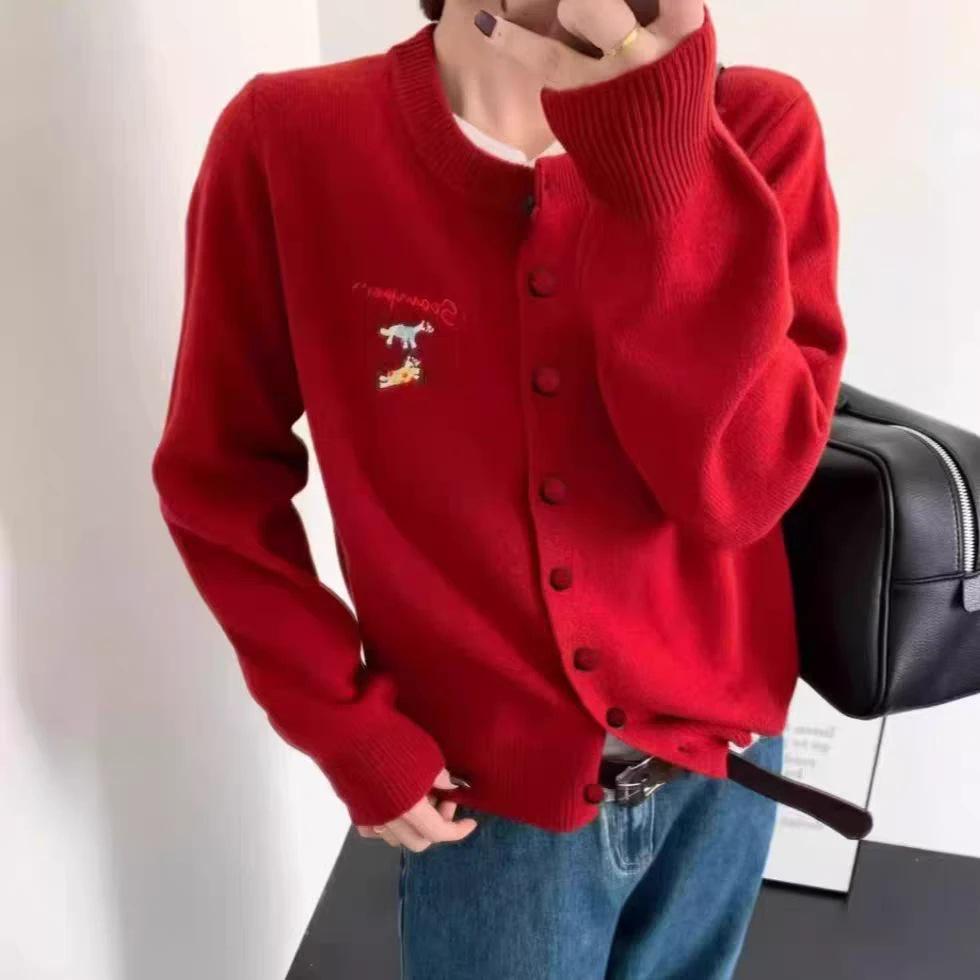 Plus Size Women's New Year Round Neck Knit Cardigan with Little Horse Embroidery – Autumn/Winter Long Sleeve Top