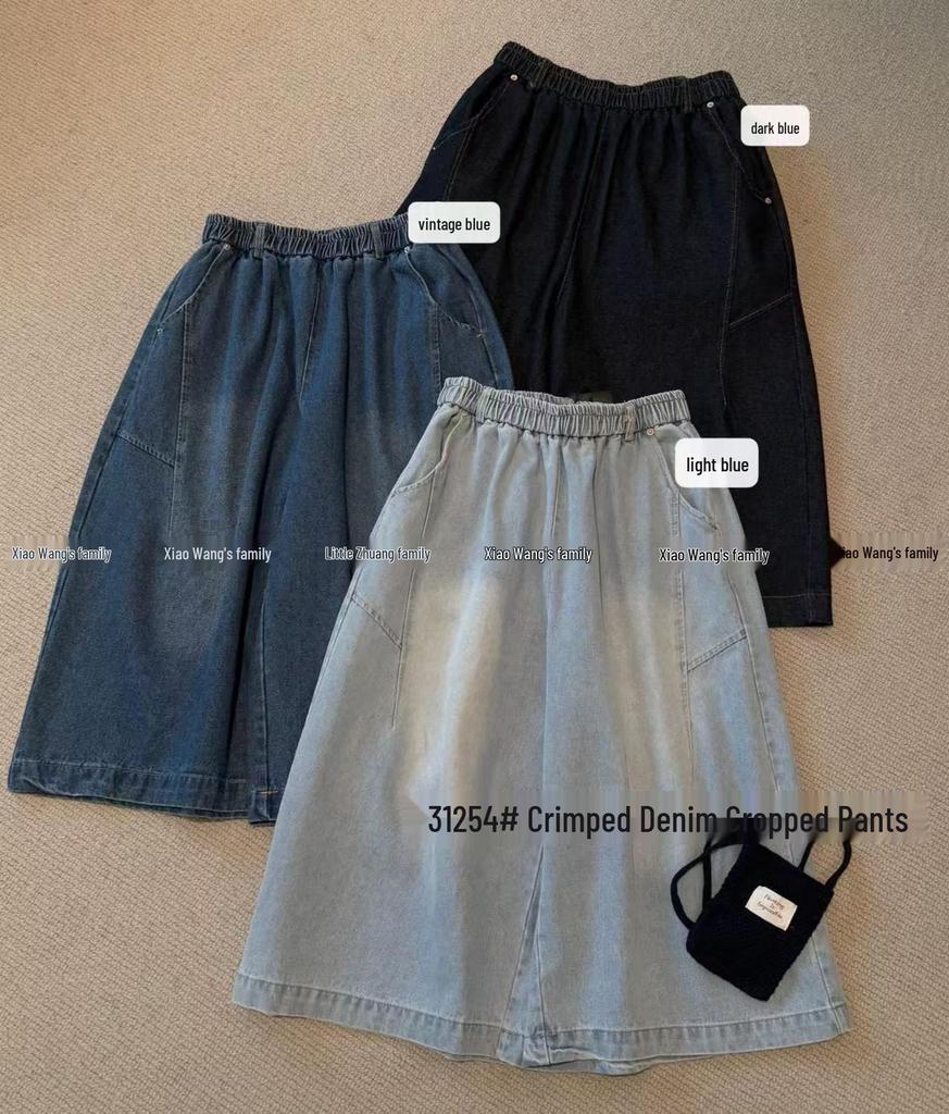 Xiao Wang Women's Plus Size High Waist Wide Leg Denim Capri Pants - Korean Style, Loose Fit, Spring Collection