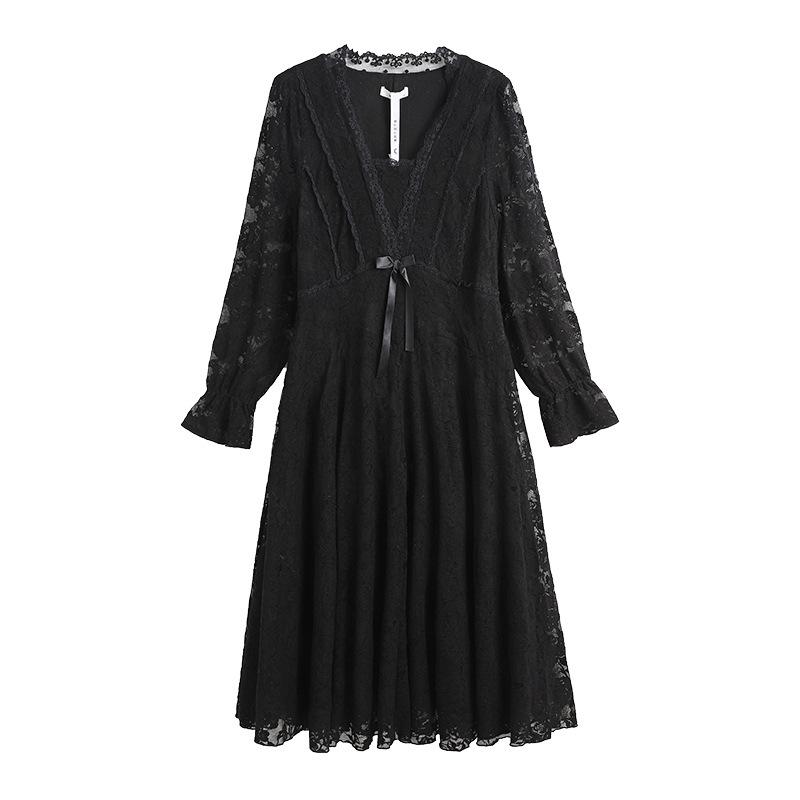This elegant Plus Size Women's Lace Dress is designed for the autumn and winter seasons, featuring a sophisticated and slimming silhouette suitable for individuals weighing between 130-300 lbs. Crafted from high-quality polyester, the dress boasts a luxurious velvet lining for added warmth and comfort. The solid pattern enhances its timeless appeal, while the delicate lace decoration adds a touch of femininity. The dress includes a flattering V-neckline and long sleeves, making it a perfect choice for formal events or special occasions.