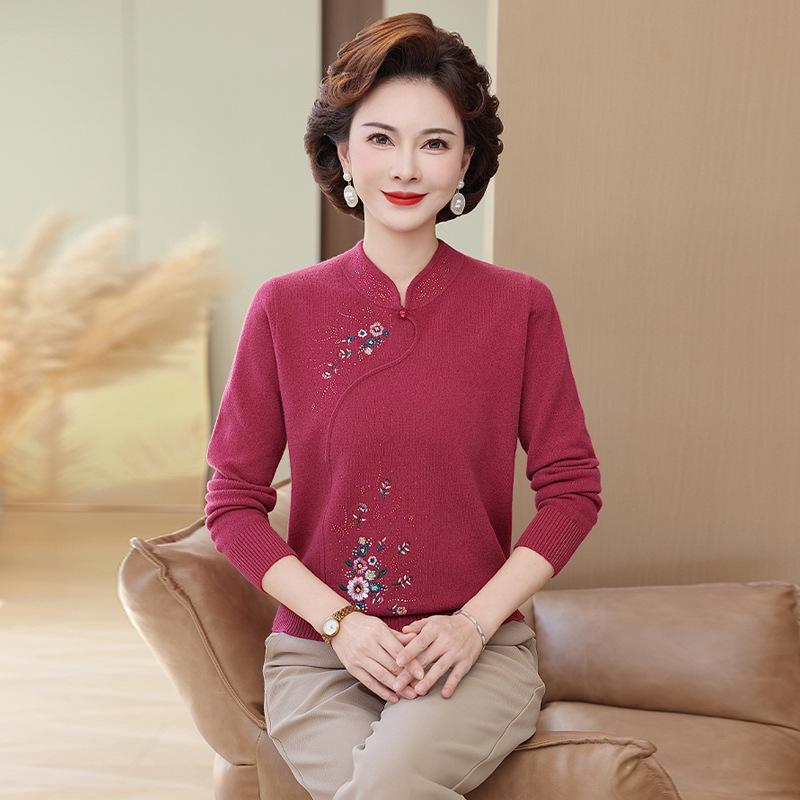 100% Pure Wool Autumn Winter Sweater for Moms - Stylish Qipao Collar Knitwear for Middle-Aged and Elderly Women.