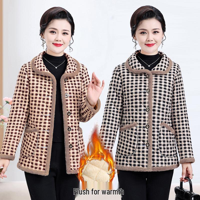 This winter jacket is designed specifically for middle-aged and elderly women, combining warmth, style, and comfort. Crafted with a plaid pattern, this medium-thickness outerwear features a V-neckline and is adorned with convenient pockets for added practicality. The cotton-padded insulation ensures you stay warm during the colder months, while the stylish design makes it a versatile addition to any wardrobe. Ideal for maintaining both fashion and functionality, this jacket is perfect for those looking to embrace the winter season with grace and ease.