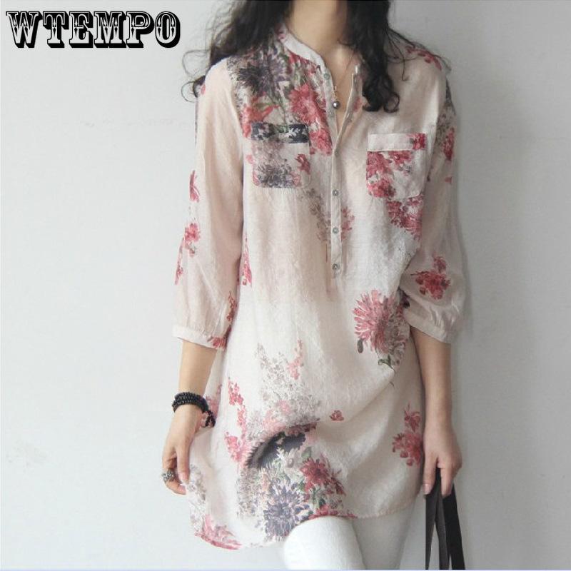 Spring and Summer Medium and Long Cotton and Hemp Shirt for Women Women's Floral Ultra Thin Artistic Shirt